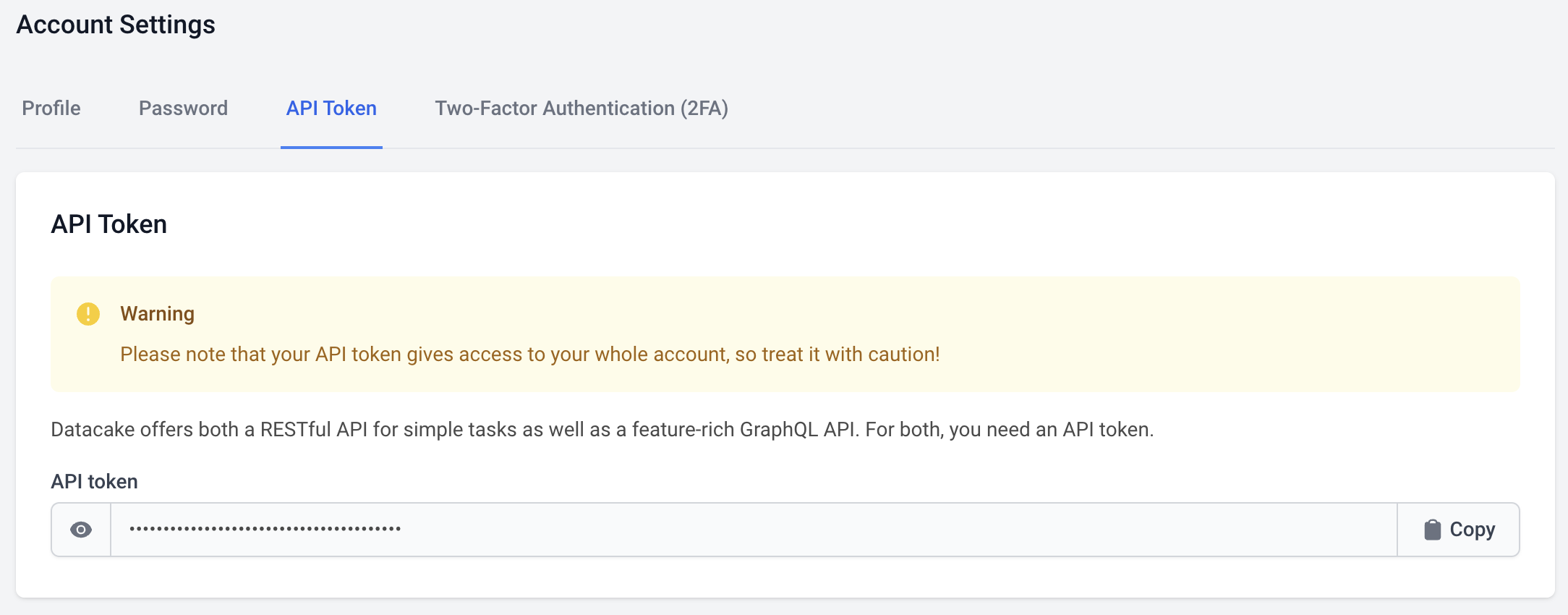 Please note that your API token gives access to your whole account, so treat it with caution! Never pass on this token. If you have been invited to other workspaces by external persons, this token is also valid for these workspaces. You are responsible for the safe use of this key!