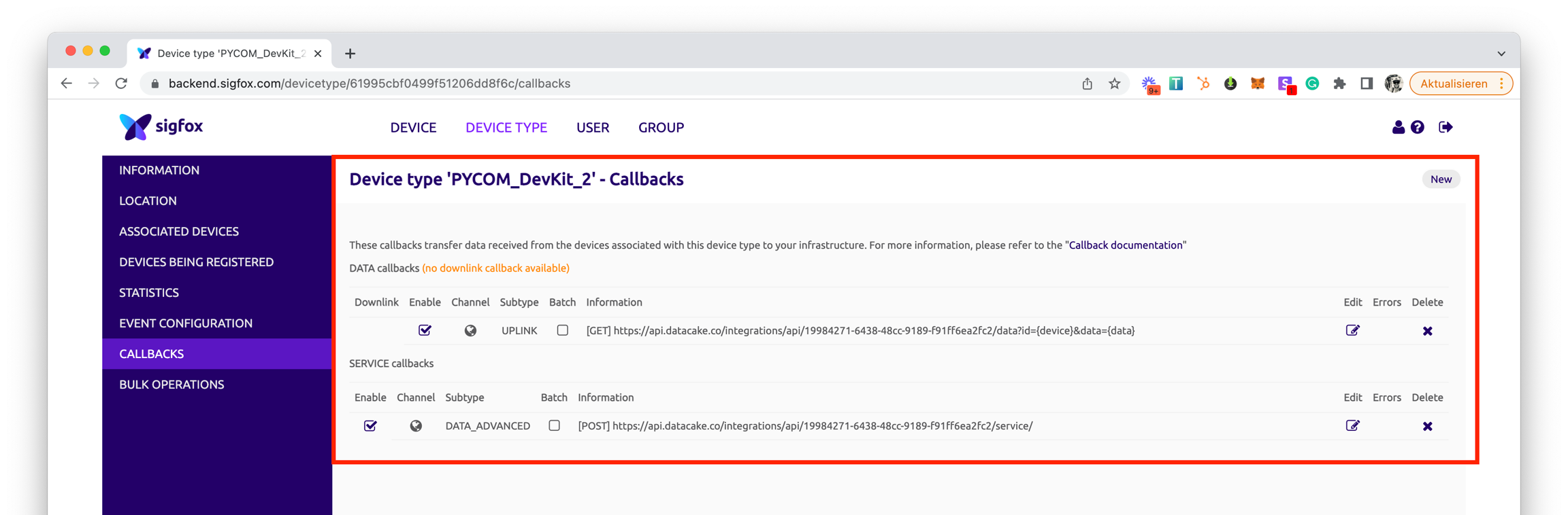 Datacake creates a custom HTTP URL for you, which you can use for all devices of a type. You must store this URL on the Sigfox backend as a callback for your device types. In this tutorial we will show you how to set this up.
