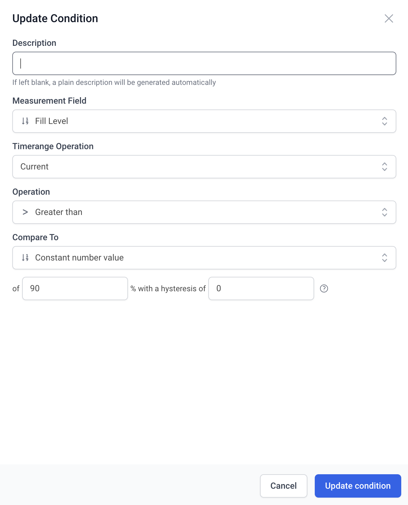 * Constant Number Value: Once this selected next thing is to set the constant number to be used. If you select Constant Number value last thing to do is to setup a [hysteresis](https://docs.datacake.de/portal/legacy-rule-engine#using-hysteresis).