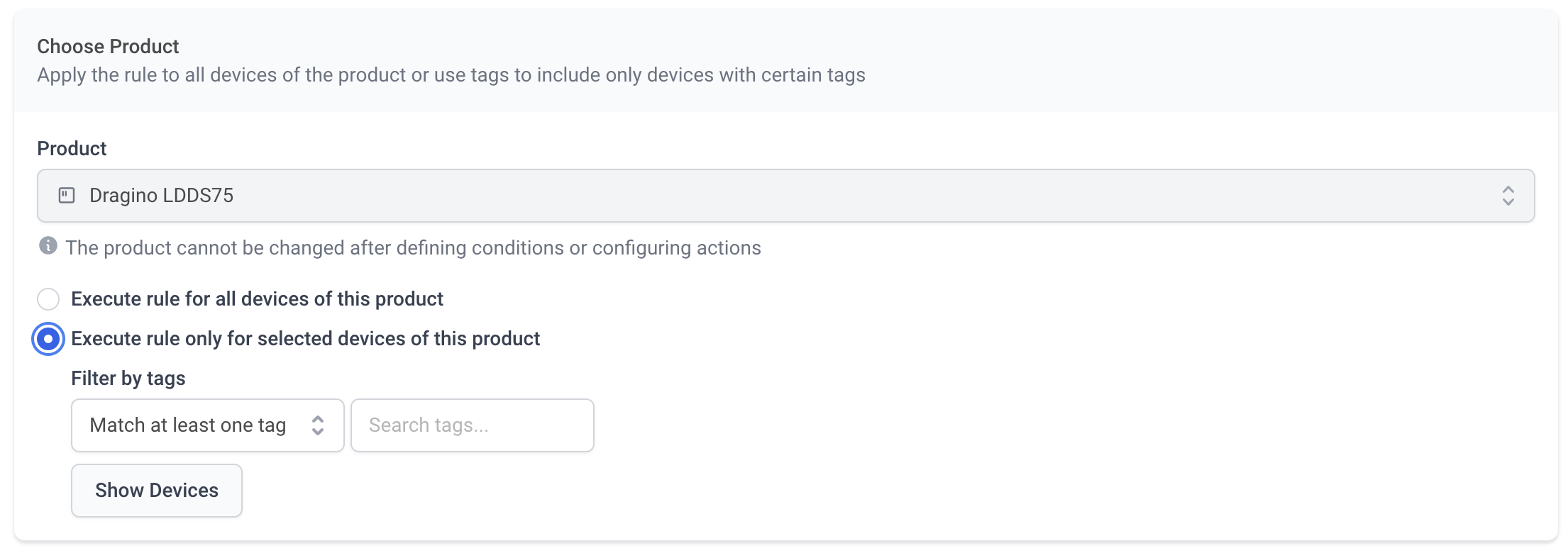 Once selected the product you are able to choose if you want to setup the rule to "Excecute rule for all devices of this product" or if you want to "Excecute rule only for selected devices of this product", which allows you to filter devices on a product with a specific tag.&#x20;