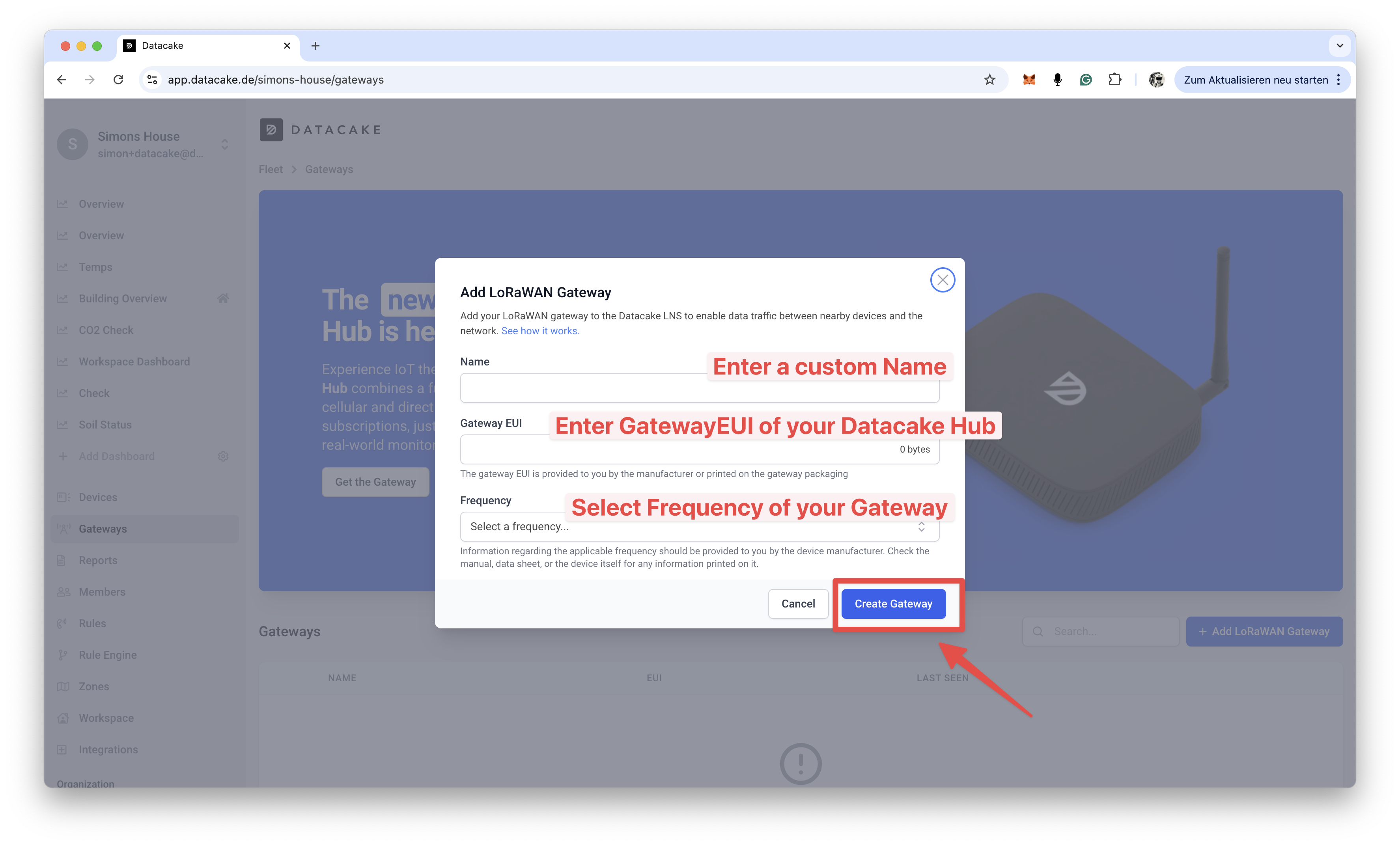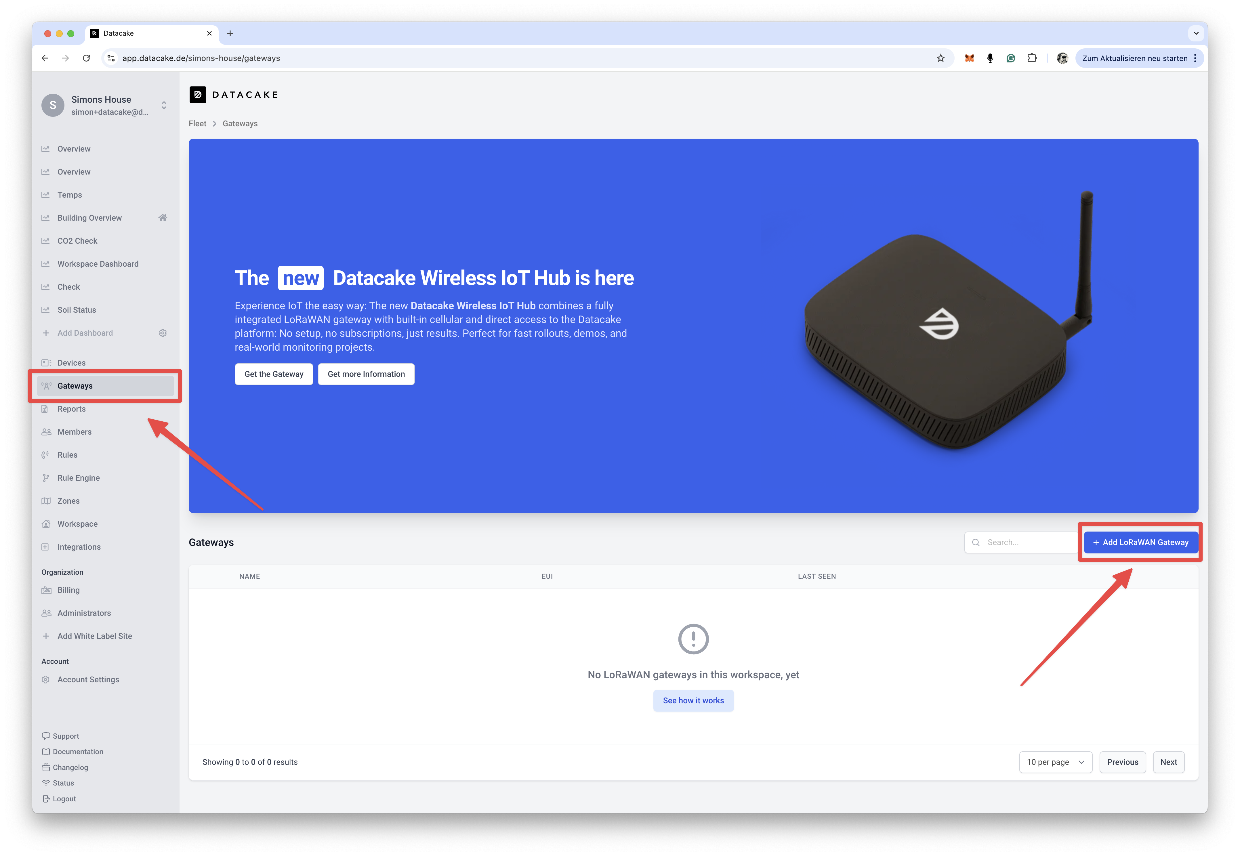 The gateway will automatically connect to the Datacake platform using the built-in SIM card.